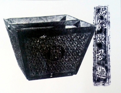 《明会典》中汇集了历年有 关度量衡器制造、管理等典章制度,仅洪武元年(公元1368年)到嘉靖末年(公元1566年)的近200年间,共颁布有关度量衡法令17次[5]。明朝官方使用的度量衡器在中央由工部统一制造,由负责钱粮的户部颁发使用。现存于中国历史博物馆的明代成化兵子铜斗(图6),是目前仅存的明代官制度量衡容器据测量,实测其容量为9635毫升。
