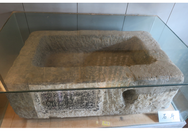 该石斗内口长69厘米,宽35厘米,深16厘米,计算容积约为38640立方厘米,经实测,能容普通小麦29.4公斤,基本符合清代河南宛西一带使用的50斤小麦为1斗的容量。然而,仔细观察此斗,制作粗糙,四壁厚薄不等,上口左侧自左至右三分之一处又有稍低于右侧约2毫米之状,显然这是在反复校准时所为。