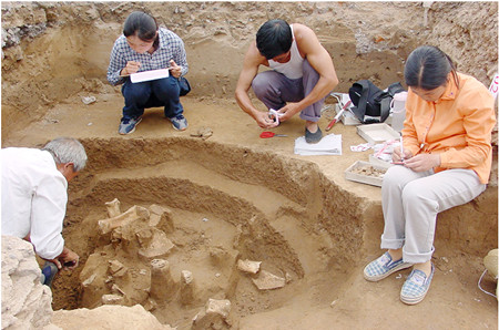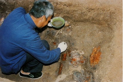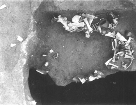 图七  1991年花园庄东地H3第1层甲骨发掘现场