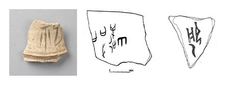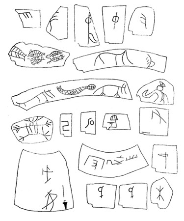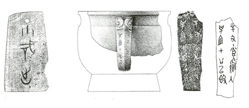 陶器上的契刻文字,大多数是在陶器制成以后、入窑烧制前刻在陶胚上的。这类陶文,笔划深而宽,字口较平滑。另一部分是在陶器烧成以后刻的,笔画浅而窄,字口多有毛茬儿。根据刘一曼的统计,自殷墟发现契刻陶文以来,共发现95片,单字122个,可释读单字64个,内容包括数字或符号、位置符号、族名或人名、记事、卦辞和其他共6类[22]
