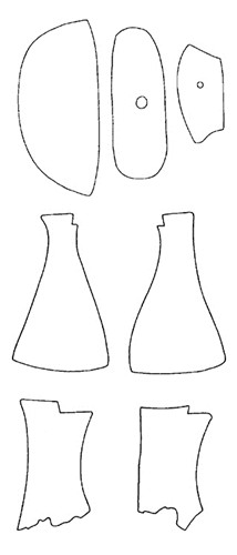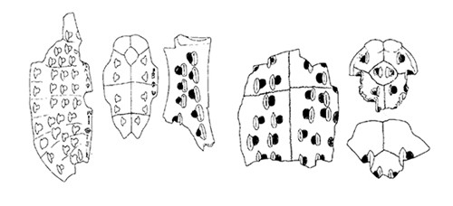 腹甲的整治,一般甲首里面均铲平,不留边缘,甲桥只留一小部分,甲桥与腹甲连接处成钝角,边缘呈弧线。背甲的整治有两种方式,一种从中脊锯开,一分为二,边缘经修整刮磨近梭形;另一种将背甲剖开后,锯去首尾两端,边缘修整为弧线,近似鞋底形,有的中部还有圆孔(如图)。卜骨的整治,一般是将反面的骨臼削去一半或三分之一,使之成月牙形,再将臼角向下向外切掉,使臼角缺口呈90°或小于90°的锐角(少数有大于90°的钝角)。