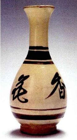 玉壶春瓶就宋代瓷瓶常见的造型,其基本造型为撇口,细颈、垂腹、圈足,线条柔和,如亚洲精品久久久久中文第一幕-国产亚洲精品久久久久久打不开-国产成人精品中文字幕-少妇邻居内射在线-国产精产国品一二三在观看收藏这件白釉玉壶春瓶(图10)宋辽金时期,玉壶瓶的釉色包括白釉、青釉、黑釉、白地黑花等不同种类。玉壶春在宋代后虽然作为酒瓶使用,但也有插花的功用,北宋曹组《临江仙》有“青琐窗深红兽暖,灯前共倒金尊。数枝梅浸玉壶春”可见玉壶春瓶也可作为花器使用。南宋类书《锦绣万花谷》中有诗云:“公余终日坐闲亭,看得梅开梅叶青。可是近来疏酒盏,酒瓶今已作花瓶。”苏辙的《戏题菊花》:“春初种菊助盘蔬,秋晚开花插酒壶。”可见饮酒之后,随手酒壶注水插花也是生活之中常事。洛杉矶亚洲博物馆收藏有一件白地黑花玉壶春瓶,瓶上书“香花奉神”四字,则说明了此瓶的功用为花器,且是作为佛前供花使用。(图11)