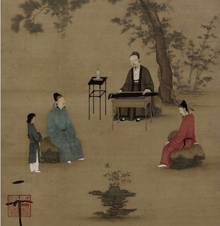 5、古器。宋代,金石学兴起,古代青铜器受到了宋人重视(图21),因此宋人除欣赏外,亦喜用古铜器插花,常见的有鼎、炉、觚、瓶等。黄公度《对瓶花独酌》记载:“红红白白两铜瓶”北宋赵佶的《听琴图》(图22)即以鼎为花品器,南宋《瑶台步月图》(图23)里即觚为花器。以古铜器为花器使宋代插花呈现出一种古朴的风格。此外,用古铜器插花,还因铜器有保养的功用,如赵希鹊在《洞天清录》中说:“古铜器人土年久气深,以之养花鲜明如枝头开速而谢迟,或谢则就瓶结实,若水锈传世古则否,陶器人土千年亦然”。以古器为花器,使宋代插花呈现是高、雅、奇、古的特质。