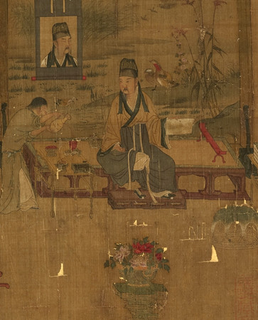 2、盘与钵状花器。除使用花瓶外,盘状花器也是宋人插花使用的花器,通常包括盘与钵。钵状花器由盘类花器发展而来,也是口大底小的器皿,高于盘。如台北故宫博物院所藏这件南宋修内司官窑灰青钵,高8.7厘米,口13.1厘米,足8.5厘米(图16)。盘状花器的特点是口径大,这类花器一般插折枝、花朵较大的花材,由于开口面积大、阔朗容可插多种花材,且易于四面造型,短花枝可直接浸润或浮于浅水,也可聚成一束、丛、簇花的形态。南北朝以来,盘花一直是佛寺道观插花的重要形式,花材多以莲花为代表,花器选择方面以盘、钵为主。宋代有关佛教题材的绘画作品中常有仙人捧盘花的形象出现(图17)。宋代厅堂的堂花也多有盘花的形式,如台北故宫博物院收藏的宋代人物图册(图18)里描绘的宋代文人生活空间里,便有钵状插花,连同画面里的焚香、点茶、挂画,体现出了宋人生活不可或缺的四艺。