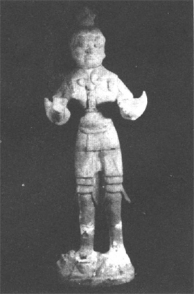 到了中晚唐期,天王俑衣饰简化,体态臃肿,制作工艺较之前粗糙简陋。整体身材较矮小,头戴半圆盔帽,帽后突出呈扇形。腰带装饰复杂,足下踏小鬼。此后,天王俑逐渐在墓葬中消失。如西安郊区M411和西安硫酸厂M7出土的两件天王俑[6]。(图10、图11)