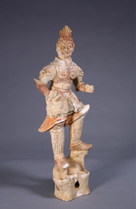 盛唐时期的天王俑,头戴兜鏊或束发,脸型丰满,多一手叉腰,一腿弯曲,足下踩夜叉。这一时期的天王俑制作精美,主体造型体格雄健,服饰华美,工艺精制,动态感强,既夸张又真实自然,给人一种和谐饱满的印象。