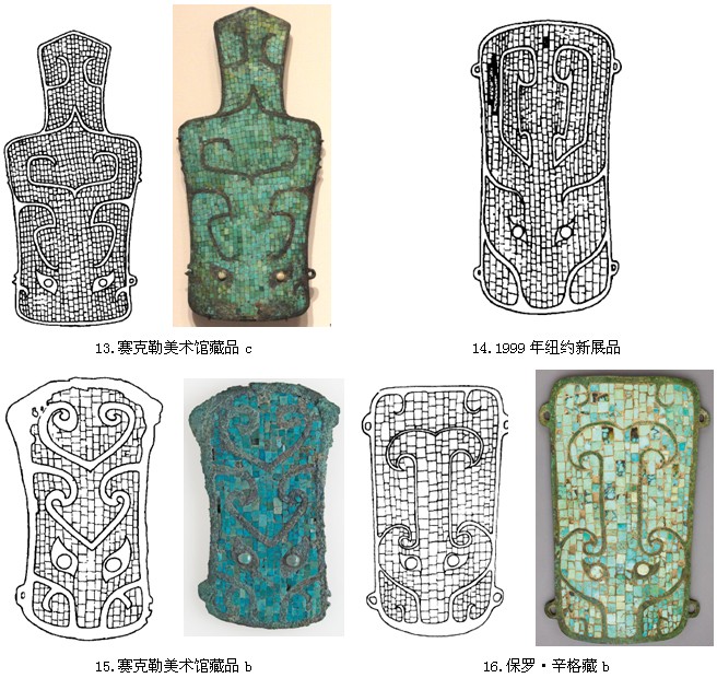 据王青先生统计,截止2002年,现存面世的镶嵌铜牌饰共有16件左右,其中存于国内的7件,即河南偃师二里头3件,四川广汉三星堆2件,广汉高骈1件,甘肃天水1件;现存国外的有9件,即美国哈佛大学赛克勒博物馆3件,保罗•辛格医生2件,檀香山艺术学院1件,日本MIHO博物馆1件,英国伦敦古董行1件和1999年美国纽约古董市场新出现的1件。[10]16件铜牌饰具体信息和形制如下[11]