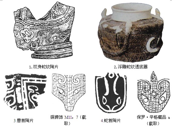 通过上图,我们可以发现:首先,蛇的形象在二里头文化中充满了诡异和违于常理的表现,如双身蛇纹(1)、双首蛇纹(7);其次,蛇的形象常出现在非一般日常用具的陶器上,如透底器、大陶盆;第三,比较蛇首陶片和铜牌饰上的陶片,我们能发现二者形式、手法、特征都非常相近;第四,陶片上蛇首的菱形额饰(1、7)与保罗•辛格藏品a铜牌饰上的完全一致。通过上述种种线索,我们能发现蛇在二里头文化中非同一般的地位,同时,蛇的形象与铜牌饰也呈现出诸多相似之处。蛇与铜牌饰所体现出的相关性,应是今后铜牌饰研究的一个重要方向。