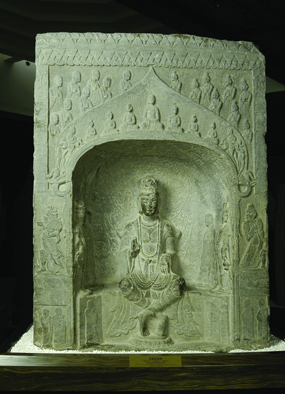 荥阳市大海寺,位于河南省郑州市西二十公里荥阳市区南端310国道旁。据碑文记载,该寺创建于北魏晚期,原名代海寺,传说观音北行渡人,移居荥阳,多次显圣救人,并以荥阳护城河河水随南海上潮示人,故名代海寺。隋唐时,李渊任荥阳郡太守。李世民十岁时突患眼疾,广医无效,后到代海寺拜佛许愿,眼疾立愈。李世民登基后,命尉迟敬德扩建该寺,规模宏大,故名大海寺,后几经兴衰,至明清时期毁灭。一九七六年在大海寺遗址处出土佛、菩萨等石刻造像42件,其中以北魏孝昌元年(525年)邑师道晗造像碑(图七)为该寺最早造像碑,余皆为唐代佛和菩萨造像,特别是唐代菩萨群像及十一面观音,形体高大,雕刻精美。