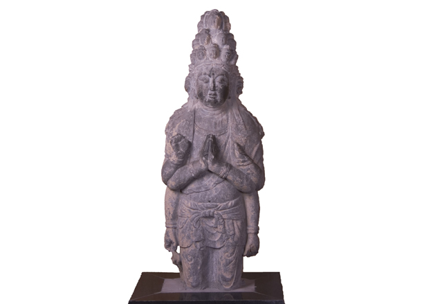 十一面观音像,是密宗观音的化身像之一,据《成菩提集》“十一面观音”条曰:十一面观音,密宗称“变异金刚”,为六观音之一,三面当前,面做慈悲相,右边三面做威怒相,左边三面利牙出相,后有一面做暴笑容,最上一面作如来相,冠中有化佛。河南省荥阳大海寺出土的十一面六臂观音造像和上述记载基本特征相符,但也稍有出入,十一面集中在正面相上,更显其威风凛凛、不可侵犯的气势,是一件优秀的艺术珍品。早期密宗造像现存不多,此像对研究密宗造像具有重要价值。