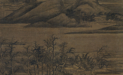 到了明代,水榭造型更简单,四周开始通透敞开,没有房屋那样封闭,视角也变得开阔。明代王谔的《溪桥访友图》便是代表,图中清晰可见山川中立有一座水榭,水榭屋顶轻薄如纸,支架纤细如枝,四面无墙,完全通透(图8)。