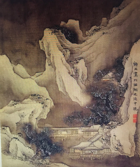 清代山水画中的水榭,在之前的基础上,又出现了一些造型庞大的水榭,且多为砖瓦或琉璃屋顶,外观更加别致。下图是清代吕焕成的《山水册》,图中水榭在山间小溪上盘旋曲折,近水一侧设有窗帘,赏景时拉开,既保证了水榭内的透光和通风,又可以供水榭中的人观景(图9)[3]