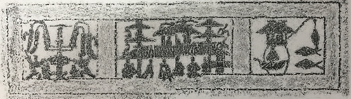 山东省微山县两城镇出土的水榭画像石(图3),其结构为在岸边立一倾斜的登梯,梯顶旁立一庑殿顶亭子,亭下有一从登梯中间伸出的弯曲粗大的立柱承托,立柱之上还有三层出挑斗拱,之下由一立墩支撑,图中共有 6 人位于登梯之上,3人位于亭中,水中亦有若干网鱼、刺鱼的人。
