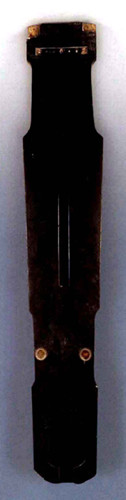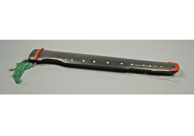 “来凰”琴。仲尼式,唐,浙江省博物馆藏。通长120.4、隐间110.7、额宽5.8、肩宽20.7、最厚5.6、尾宽13.5厘米。漫圆肥厚的琴面,项与腰两处边沿的特殊处理。肩在二三徽中间,腰上至八徽、下至十一徽下,足在九十徽中间。(图4)