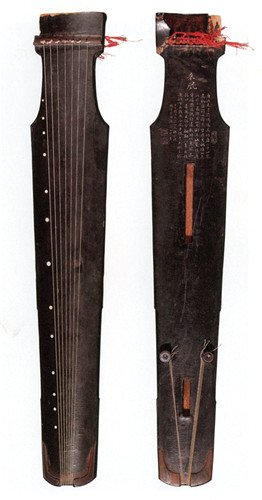 “玉润鸣泉”琴。仲尼式,宋,山东省博物馆藏。通长137.0、隐间122.5、肩宽24.0、尾宽16.5、厚4.5厘米。体宽而扁。肩在三徽下,腰上至八徽、下至十一徽上,足在九十徽中间。(图6)