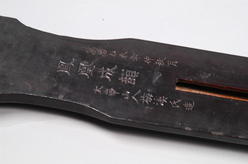 “凤凰成韵”琴。桐木面板,色黄,极松软,纹理顺直;硬木岳尾,上涂朱漆;涂金饰螺钿琴徽,木足,六棱形青玉轸;琴体秀美,琴面弧度较平,具有薄而轻的特点,重量极轻,边棱明显;承露方角,与岳山共用一木,长度相同;冠角、焦尾明显,结处较尖,龙龈承弦不明显,龈托半圆形;一足缺失,另一足呈柱基形;长方形龙池、凤沼,均无贴格,纳音微隆;岳山长与边齐,肩在三徽,腰上至九徽偏上、下至十一徽偏上,足在十徽偏上,龙池长27.0厘米、宽2.2厘米,凤沼长11.2厘米、宽2.3厘米,瓦灰、极薄,没见葛布,似有朱漆底,黑色光漆、亮度较差。底板在琴肩附近刻有铭文三行,中间刻“凤凰成韵”,右刻“万历乙未年中秋月”,左刻“太华山人梅溪氏造”(图2)。此琴应是明代万历二十三年(1595年)斫制。