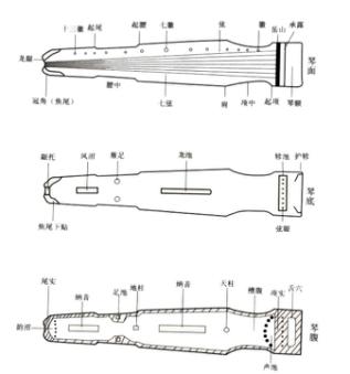 宋代的斫琴文献是现在已发现的最早的较完整、较系统的斫琴文献,后世的大多数斫琴文献都引用或转载宋代文献的内容,宋代斫琴文献中以《碧落子斫琴法》[4]《琴苑要录·琴书》[5]《太古遗音》[6]等文献对琴体形制的记述最为全面和详细,对后世影响也最大。综合宋代斫琴文献记载的古琴形制:通长,平均约三尺六寸六分(约113.5厘米),最长三尺八寸四分(约119.0厘米),最短三尺六寸(约111.6厘米);隐间,平均约三尺四寸(约105.4厘米);肩宽,平均约六寸(约18.6厘米),最宽七寸四分(约22.9厘米);尾宽,多为四寸(约12.4厘米);最厚,一寸八分(约5.6厘米)或一寸五分(约4.7厘米);额宽,平均约五寸五分(约17.05厘米),最窄五寸二分(约16.12厘米);头部厚,平均约一寸二分(约3.72厘米),最厚一寸四分(约4.34厘米);项宽,四寸(约12.4厘米);通长与肩宽比平均约为6.1,通长与尾宽比平均约为9.15;琴肩位置,多为三徽正,最下为三徽下三分之一处;琴腰位置,多为八徽至十二徽上;琴足位置,基本都在九徽与十徽中间。