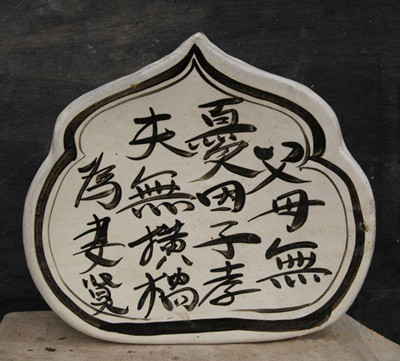 这件磁州窑如意形枕(图5),白釉褐彩,枕面上书“父母无忧因子孝,夫无横祸为妻贤”造形优美,文字为行书,书写比较随心、自然,但有天然质朴之美,反映出宋人闲适的心境,其书写内容为流行格言,劝世人要子孝妻贤,也是持家之良言,反映出宋人务实的心态。