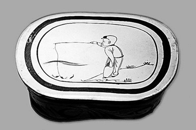 这件宋磁州窑白釉童子垂钓纹瓷枕(图7),平面呈椭圆形,元宝状,枕面近边沿处绘两道粗细不一的线框,线框内绘一童子伫立岸边垂钓,童子身稍作前倾如视水中,右臂伸直平举钓竿,竿端有细线垂入水中,水中三游鱼已有一鱼作吞饵食状。整个画面只用廖廖几笔,就勾勒出一幅生动逼真的童子钓鱼图,让人顿时联想到清净闲适的乡村生活场景。