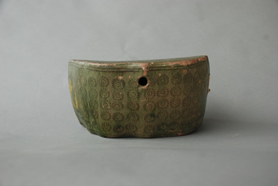 唐代如意形菊纹瓷枕,枕面两边微翘,中部稍凹,如意形。弧壁,前腹微凸,后肩稍后引,造型端庄雅致。通体施绿釉,部分脱釉露胎,釉薄处胎色隐显。枕心内空,在后部中间距上沿2.3厘米处有一直径0.7厘米的小孔,以防烧制时枕心内高温引起空气膨胀而爆裂,同时可使枕内部空气流通,枕起来更加凉爽舒适。枕面中部镶嵌一组直径7厘米的莲瓣纹团花,两侧各镶嵌一组4.25×3.8莲蕾纹团花,莲花及莲蕾均为绞胎工艺制做,辅以刻画、填刻等工艺,图案丰满,富于变化,在三组团花纹饰的间隙还戳印无数细小圆圈组成连珠纹。枕面近边缘处有数组菊花纹图案,外沿及枕壁的边沿各镶嵌二条褐色泥条作为边缘装饰。四面枕壁上,用各种工具戳印圆点、圆圈、放射线组成菊花纹样装饰。该枕的装饰,既繁缛富丽,又端庄素雅。制作、装饰工艺较为复杂,具有很高的历史、艺术和科研价值(图1、图2)。