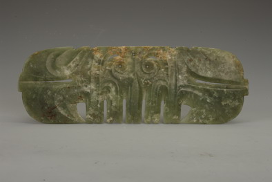 这一时期鼎身出现兽面纹,是铜鼎发展历史中极为重要的一个环节。兽面纹的具体含义一直被学者们所争论不休。学者们也根据兽面纹的具体形象做了不同型式的划分,但是大多数学者所根据的都是商代后期以来的兽面形象。如果考察商代前期兽面造型,大体上很相似,且极为抽象,无法与现实生活中具体动物形象比附,不象商代后期那样可以把兽面纹具体到象牛,象羊,象虎,或者象鹿、甚至是枭鸟等。因此,商代前期这种兽面形象完全是抽象,超现实的。这种兽面的形象可从商以前找到线索,如红山文化兽面纹玉牌饰(图14)、良渚文化玉琮兽面纹(图15)、龙山文化玉圭兽面纹(图16)以及夏代嵌绿松石兽面纹牌饰(图17)等。古人之所以把兽面形象做得如此抽象,绝非因为对于具体的形象无法把握,只需看看新石器时代诸多象生的玉雕、泥塑动物甚至人物多么惟妙惟肖便可明白这一点。