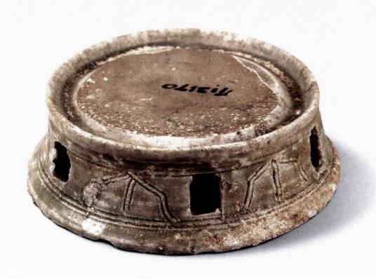 南北朝时期,辟雍砚有了进一步的发展,砚面的弧形凸起更高,略呈馒头状,墨渠更深,如南京郊区对门山南朝墓出土的青瓷三足砚(图4),底部已呈明显上弧状[20]。个别砚面在弧形凸起部作较小的平台,显示砚面自馒头形向圆台形的过渡。多足砚数量骤然增多,砚足数量增加,以下置六至十足兽足最为流行。安阳北齐贾进墓出土的青釉多足瓷砚(图5),砚面上鼓初现圆台状,其下附八个蹄状足[21],是这一时期辟雍砚的典型形制。同时,这一时期,新出现圈足砚形制,如安陆黄金山出土的陶砚(图6),圈足外撇,足上有八个圆形镂空[22]。应为在蹄足的基础上,适应暖砚需求而做。