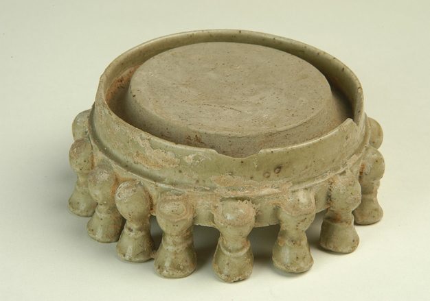 青釉辟雍砚,圆形,砚面平整微凹,四周为环形水槽形成砚池用以储存墨汁,下有间隔不等的15个蹄足围成一周。蹄足束腰部分饰凸弦纹一道。砚盘周边有子口以承盖。 除砚面外,通体施青釉,釉层均匀明亮有光泽。此砚制作规整,造型独特,是隋代的典型器物。