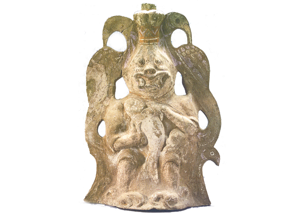 灰陶,上施彩绘。陶器由模制和捏塑而成。正面为一坐姿神人。神人头戴花冠,冠顶似蒜头状。冠上残留有红彩并绘有三角形等几何纹饰。冠正中有短圆柱,中空,似做插物之用。神人面部肥胖,两眼突起,鼻梁高隆,咧口露齿,脖颈短而粗,身躯呈人体状,肩膀隆起,上身着衣,袖口撸至上臂。神人正坐,两腿分开,下体着裤,裤脚亦挽至膝盖。神人手脚均作鸟爪状。双手紧抱一鱼,贴于胸前。鱼身躯扭动,似作挣扎。鱼身残有白彩。神人两侧对称各塑二鸟,上面二鸟鸟首相背,各立于神人左右肩上。鸟回首,长喙略勾垂于翅上,脖颈系绶带。鸟身以圆点纹和羽毛纹装饰。鸟翅部分绘有紫、白彩绘。长尾饰以白色长线条,下垂与下部鸟首相接。神人两侧下部二鸟体形明显较小,短喙,与上面二鸟造型不同。鸟身上残留白彩。陶器背面平坦,原有彩绘大部分已脱落。