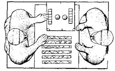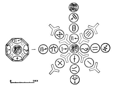 箸和焭。博箸,出土实物表明,箸系将小圆竹劈开,中空,填以金属粉、铜丝或以其它物质加固而成,外髹漆,其断面呈新月形。箸长一般为棋长之十倍。箸的数量一般为六根,故名六博。对博的双方各有六枚棋子,对博时要先投箸,根据投的结果决定行棋,最后一方将另一方的枭棋子杀掉,于是获胜。对于六博的具体下法,目前仍是未知之谜[5]。《说文•竹部》:“簙,局戏也,六箸十二棋也”。但也有用二箸和八箸的。有的博具没有箸,但有焭。焭与箸的作用相同。焭通常为直径5厘米左右的十八面球体,每面阴刻文字,除从一至十六的数字外,其它两面,一面刻“骄”字一个,相对的一面刻“”或“”字。(图六)