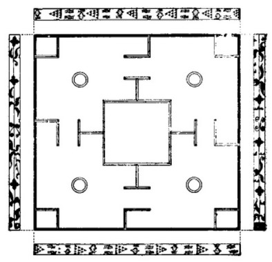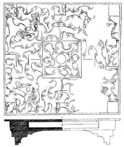 秦汉时期的博具主要由局、棋、箸或焭组成。局是用一块方形或长方形的木板制成的,一般边长30-45厘米,髹漆,多数有底足。局的面上中间刻10厘米见方的正方形,周围或朱绘,或阴刻,或用象牙条镶嵌出十二个“T”、“”形专供行棋用的曲道和方框。有的漆局四个侧面彩绘几何纹、火焰状云气纹、花草纹等图案,间饰羽人及麒麟、青龙、白虎、朱雀等。有的博局的四周沿镶有铜框或象牙框子。(图三、图四)