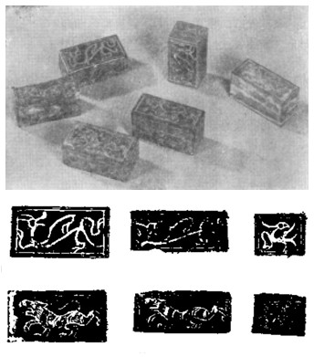 博局的棋子一般为十二颗,大小在2-5厘米之间。形制大致分为三种,一种是形制大小完全相同的十二颗棋子,六白六黑,分成二组。一种是用形状不同来区别,一组为方形棋子,另一组为长方形棋子,每组六颗棋子,如云梦睡地虎11号秦墓出土的十二颗棋子均髹黑漆。另一种是十二颗棋子分两组,每组六颗一大五小,且大棋与小棋的颜色也不同。大棋称为“枭棋”,小棋称为“散棋”,大棋和小棋在博戏中所起的作用不同。从出土实物看,棋子除由象牙制成,还有青玉和水晶制成的棋子。从北京大葆台西汉墓出土的象牙六博棋子(图五)上面雕刻有龙、虎、鸟兽纹饰,可以看出当时贵族阶层使用的棋子是特别讲究的。