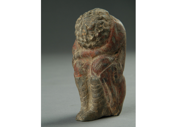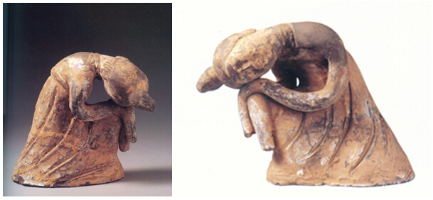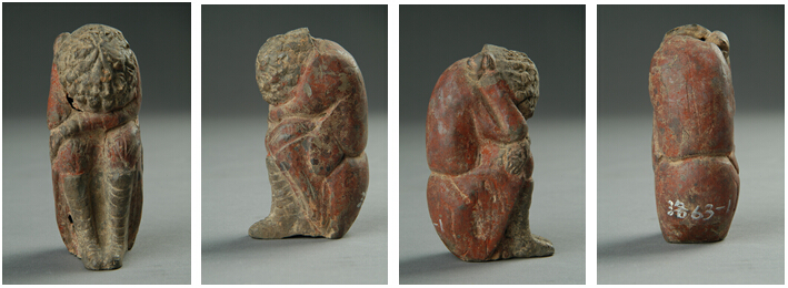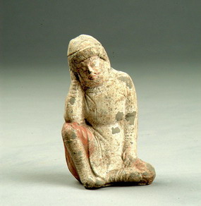 这件小型彩绘陶俑并腿蹲坐,左臂置于膝上,深深垂首,右臂抚于颈后,从侧面看去,整个身体紧紧蜷缩在一起,煞是可怜。观其服饰,身着束腰袍,下着裤,足穿长筒靴,身施红彩。唯一可从那一头卷发判断其身份,它可能是个远道而来的“异族人”,既非汉人,亦非鲜卑人。从其可见的外貌服饰来看,它也许从西方来,也许从南方来,加上其独特的造型,留给观者无限的想象空间。(图1)