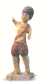 关于昆仑人的外貌服饰,《晋书·扶南传》(扶南为今东南亚一带)称:“(人)皆丑黑、拳发、裸身、跣行。”唐代张籍的《昆仑儿》一诗说:“昆仑家住海中州,蛮客将来汉地游。言语解教秦吉了,波涛初过郁林洲。金环欲落曾穿耳,螺髻长卷不裹头。自爱肌肤黑如漆,行时半脱木棉裘。”由此可见,昆仑人肤色黑,螺髻卷发,裸身,赤脚。的确,这样的描述在唐代墓俑中得到了验证,如唐郑仁泰墓出土的一件彩绘昆仑俑,可以看出其服饰、体态与文献记载相同。(图4)