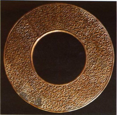 商代玉璧(图3) 出土于安阳殷墟妇好墓。商代晚期玉璧。直径18.6、孔径6厘米。绿色,有褐色斑块及灰白色沁痕。边缘与孔都较圆,孔周两面都凸起呈圆口状。两面各饰四组同心圆弦纹,每组由一条粗线和三条细线构成,线条规整流畅,工艺水平较高。