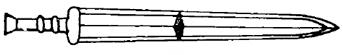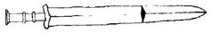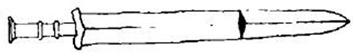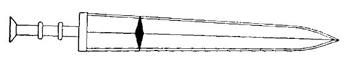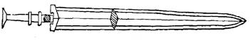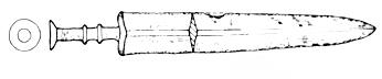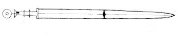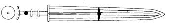 河南洛阳凯旋路南东周墓葬第三期97LM453:15剑,属于战国早中期。剑身较宽,后宽前窄。健身中部隆起成脊,脊两侧内凹。菱形窄薄格。柱状茎,茎上有两道箍,圆盘形首。通长39.3厘米。[9]