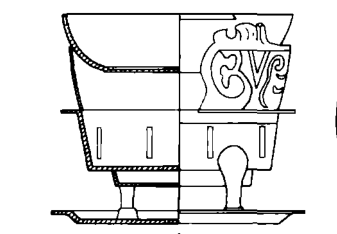 江苏邗江县姚庄汉墓M102出土有一套完整染炉,整器长16.6厘米,宽12厘米,通高14.2厘米,由承盘、炉和染杯三部分组成。染杯形如耳杯。炉身呈长方形,口大底小,斜直壁,平底,镂空。炉身腰部有宽平方边的腰沿,腰沿上方为镂空博山式支边,悬空支撑着染杯,腰沿下为炉膛。炉壁四周有14道竖条状气孔,炉底亦有条状气孔10道,炉下有一横穿炉底的长方形孔道,炉底两侧置四蹄足。炉下为长方形宽平沿承盘[5]。(图2)