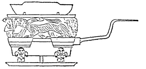 山西省太原市尖草坪一号汉墓出土了一对染炉,两炉形制相同,大小一致,全器通长11.5厘米,通长24厘米,由承盘、炉体和耳杯三部分组成。承盘略呈圆角长方形,素面。盘上置4个侏儒支托炉体。炉体底面有两排长条状镂孔,每排5孔,共10孔,使炉底呈箅状。炉处侧附有之字形曲柄。炉体上部为椭圆形围栏,四壁镂有青龙、白虎、朱雀、玄武四神,口沿上凸起四个支钉,上承耳杯。(图3)