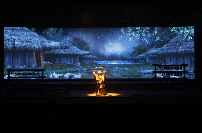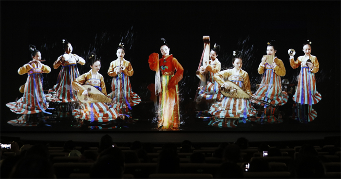 “华夏古乐——音乐文物复原展演”较以前有了很大的变化,现场观众时而被逼真的场景与真人演奏相结合的《远古的回响》带动,瞬间穿越至远古时代的部落生活;时而又仿佛坐在庄严肃穆的大殿之上,沉浸在恢宏大气的先秦礼乐中;时而跨越时空与山海,体验一把人在古画中游。可谓文化与科技一相逢,便胜却人间无数。这些沉浸式舞台美术视觉素材制作应用主要就是运用了全息影像,AR、VR等数字化技术