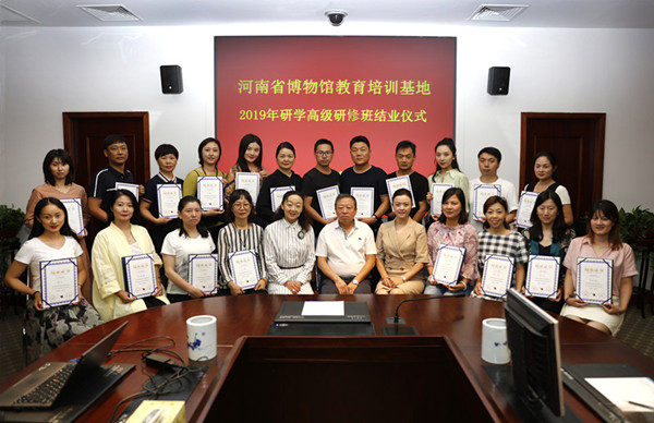 2019年7月31日,河南省博物馆教育培训基地2019年博物馆研学高级研修班在内蒙古博物院圆满落下帷幕。来自河南省郑州、洛阳、安阳、南阳、平顶山等多个地区共17家文博单位的20多名学员喜获结业证书。内蒙古博物院副院长付宁、中国博物馆协会社教专业委员会副主任委员乌兰托娅、河南省博物馆学会社教专业委员会主任委员兼研修班领队林晓平作为颁奖嘉宾,共同见证了来自河南博物馆界的这次两地培训成功的喜悦。