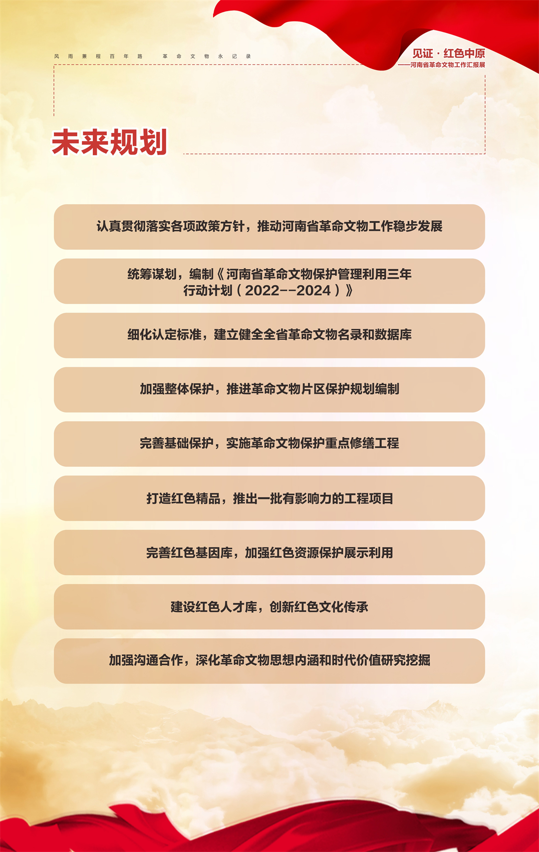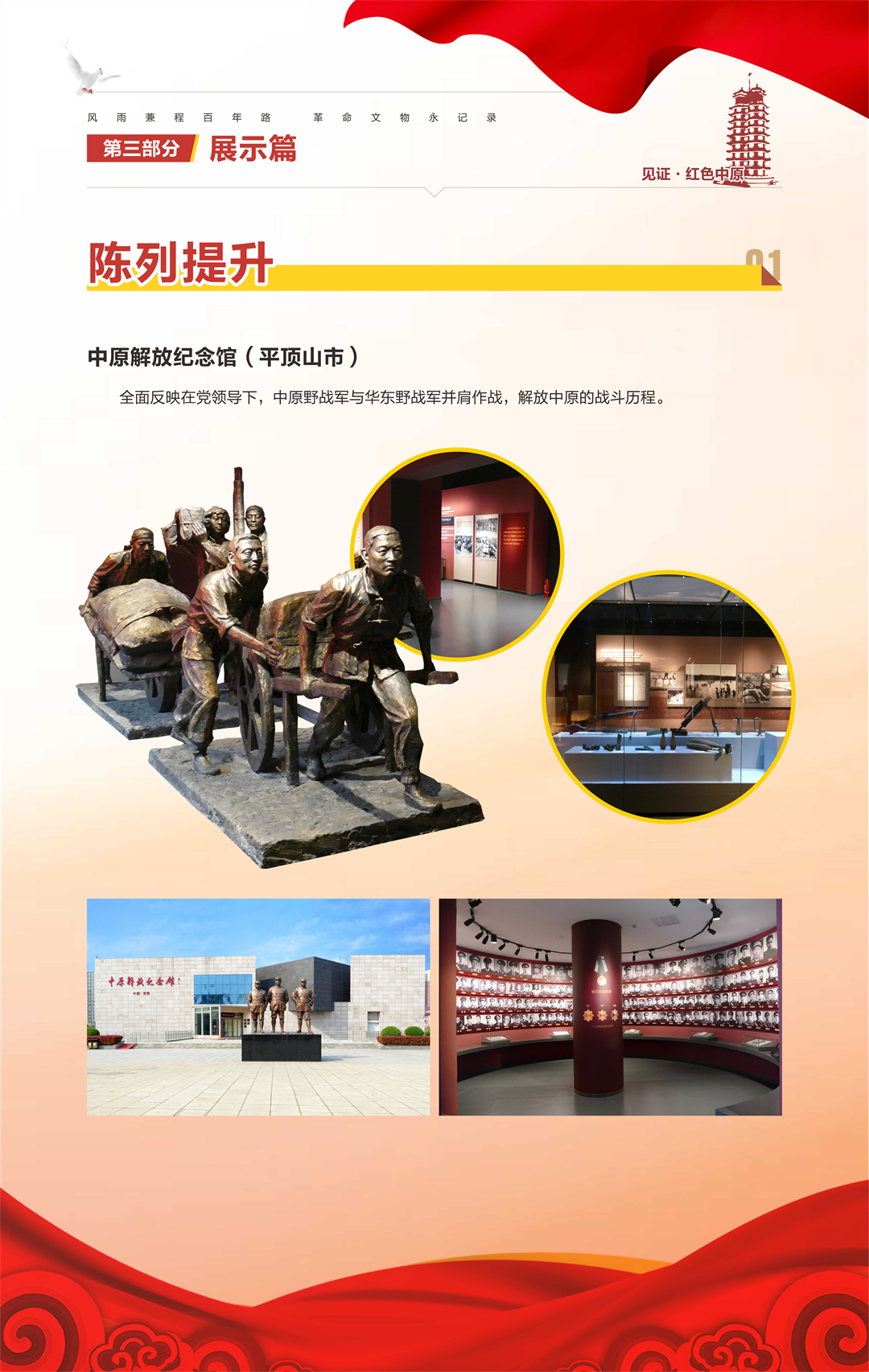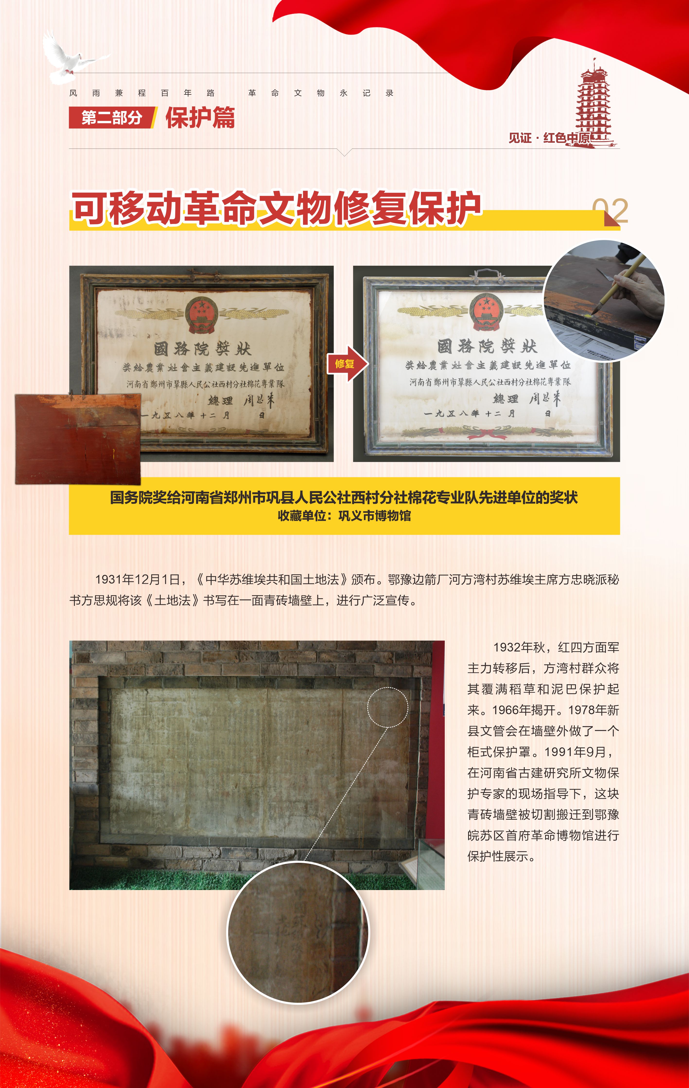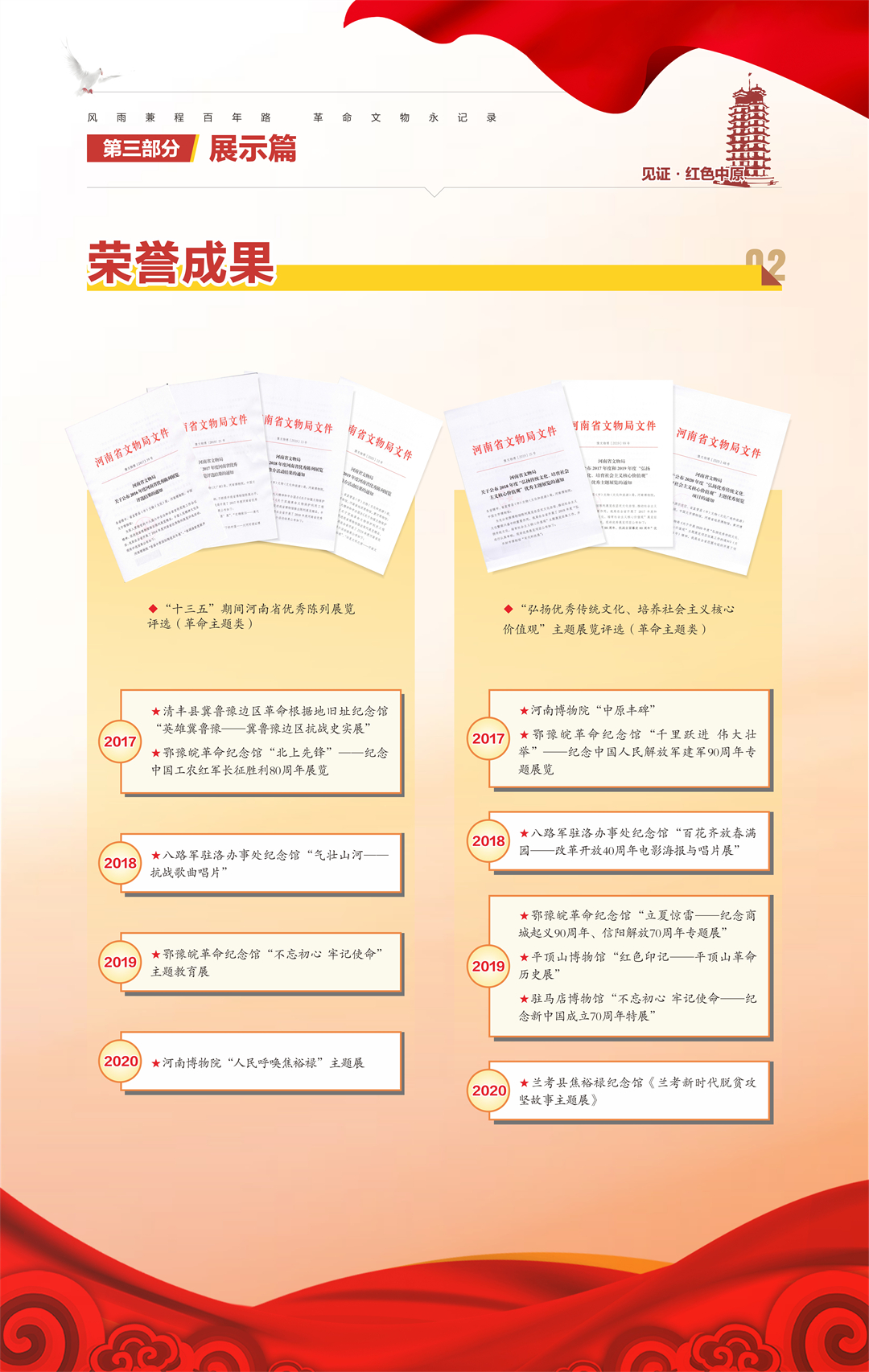 “河南省‘十三五’革命文物工作成果汇报展”是由河南省文物局策划组织,庆祝中国共产党成立100周年系列活动之一,旨在梳理“十三五”期间我省革命文物工作,展现主要成果,总结经验,宣扬优秀案例,传承革命精神,继续谱写“十四五”我省革命文物事业新篇章。
