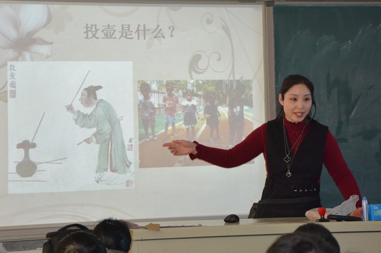 讲解员段晓静带来的讲座《寓教于乐、古老悠久的游戏——投壶》是针对于中学生这类受众群体所精心准备的宣讲内容。投壶是我国的非物质文化遗产,有着悠久而厚重的历史文化。在开始讲座之前,讲解员段晓静以热播剧《芈月传》中投壶游戏的影视片段为切入点,立刻引起了同学们的兴趣。讲座内容由投壶是什么,投壶礼仪的产生,投壶游戏的发展,投壶游戏的规则以及投壶游戏所包含的文化内涵五部分组成,为了达到寓教于乐的目的,讲解员段晓静还在讲座中设置了投壶游戏竞技比赛的互动环节,用纸篓代替壶、筷子代替箭,让同学们亲身体验了一下这项古老的游戏。在短短的四十多分钟的讲座中同学们不仅系统的掌握了与投壶相关的历史知识,渐渐地喜欢上了投壶游戏,而且还在欢声笑语中感受到了中原历史文化的博大精深、源远流长。
