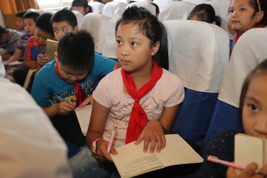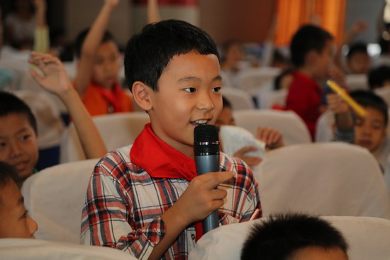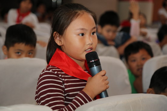 宣讲团主持人说“战争带来的死亡与毁灭,已渐渐离我们远去。可是,历史书页上这浓重的一笔永远也不会抹去。我们了解历史,不仅是为了缅怀先烈,更重要的是要着眼未来。落后就要挨打,新时代要求我们青少年有睿智的大脑、敏捷的思维、广博的知识、健康的体魄以及火一般的激情。同学们,如果有人再次侵略我们,你会怎么做?主持人提问话音刚落,会场上同学们就高高地举起了小手,第一位同学说,如果有人侵略祖国,一定会第一时间站出来与敌人对抗到底。一位女同学表示,智慧是最强大的武器,从现在起要加倍努力学习,用知识和科技武装自己。她掷地有声的话唤起了全体师生的共鸣,同学们热血沸腾,情不自禁的大声朗诵抗战题材课文《歌唱二小放牛郎》,以表达自己对先烈的敬仰。