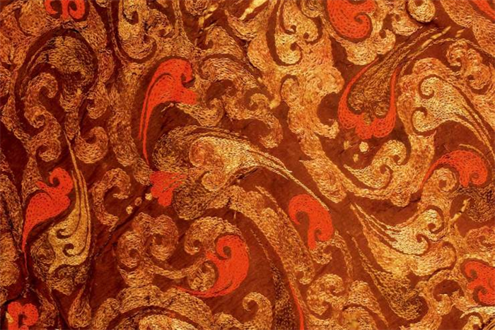 马王堆1号墓出土的西汉绛紫“长寿绣”丝锦袍局部