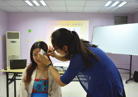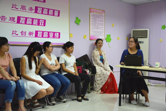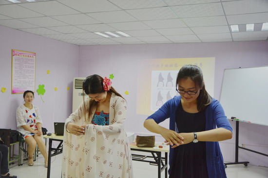 宣讲最后,河南省妇女干部学校老师身着唐装,陈莹莹现场示范并讲解唐代女子贴花钿、点面靥、描斜红的方式方法及来历。示范结束后,两人共同行唐礼致谢,在温馨愉快的气氛中结束了一个小时的宣讲活动。整个宣讲过程中欢声笑语不断,互动体验不断,轻松热闹的气氛感染着在场的所有人。