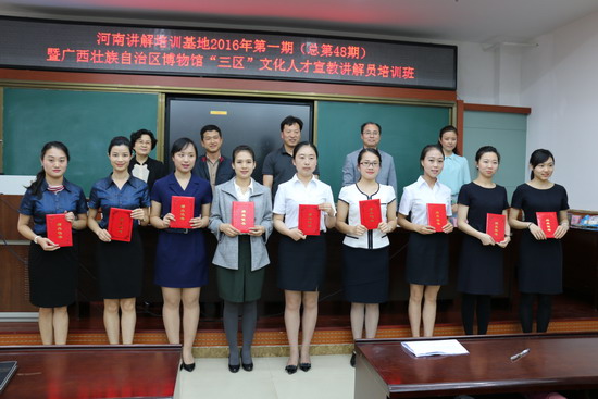 “河南是文物大省,文物事业在全国一直都是佼佼者,河南讲解基地的师资力量十分雄厚,九天的培训时间,学员们的知识储备、仪容仪表、精神面貌有了很大的改观,看到学员们的点滴进步,很欣慰。希冀学员们在以后的生活学习上,加强自我修行,不辜负领导和基地老师的期望。”广西壮族自治区博物馆副馆长陆文东在讲话中说。