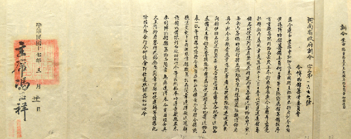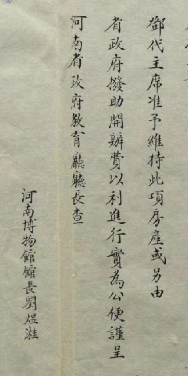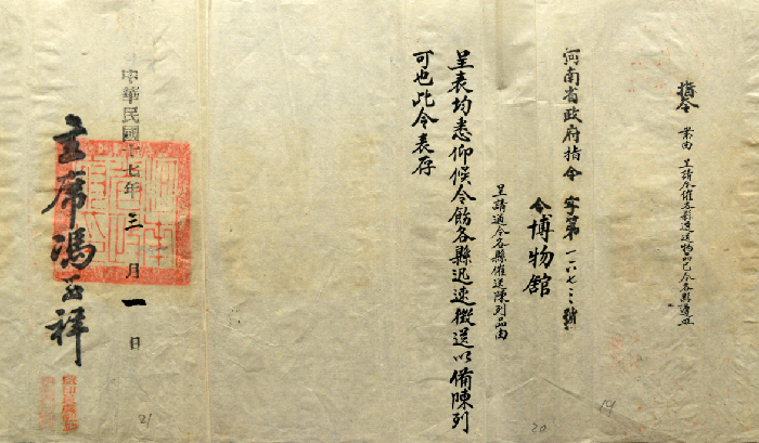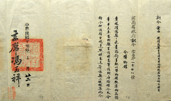 “查博物馆之设置,东西各国视为切要。因与一般民众之开拓见闻,增进智识綦有关系,非徒事陈设富丽侈为美观已也。河南夙称声明文物之区,开化最早,其天然之物产以及历代图史典籍之留遗品类,至为繁夥。或为公家予以不完全之保管,或为私人所珍藏,若无一定处所收罗陈列,以为大雅鸿博之钜观,殊于保存国粹,开拓民智,均未臻完善办法,况革命军此次会师入豫,本政府从新建设一切军事政治工作,纪念尤为宝贵,应即设馆,广为陈列,俾人游观以激发国民革命之精神。惟该馆既系创设规模宜取宏大,地址宜求适当,应如何筹备设置,必须指定专员负责办理,以便早观厥成。查该厅主管事项与博物有种种关系,为此令仰该厅长即便遵照,迅将创设河南博物馆各事宜,赶速妥为筹画(划)负责办理,以壮观瞻……。”