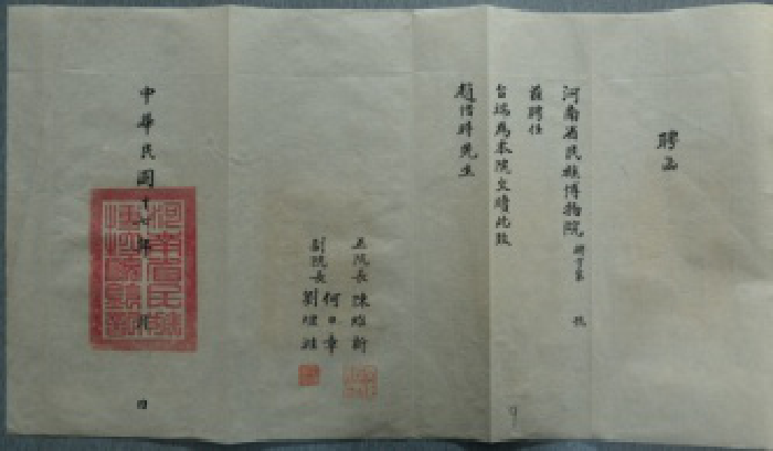 图十四:1928年6月河南民族博物院赵惜时职员聘书