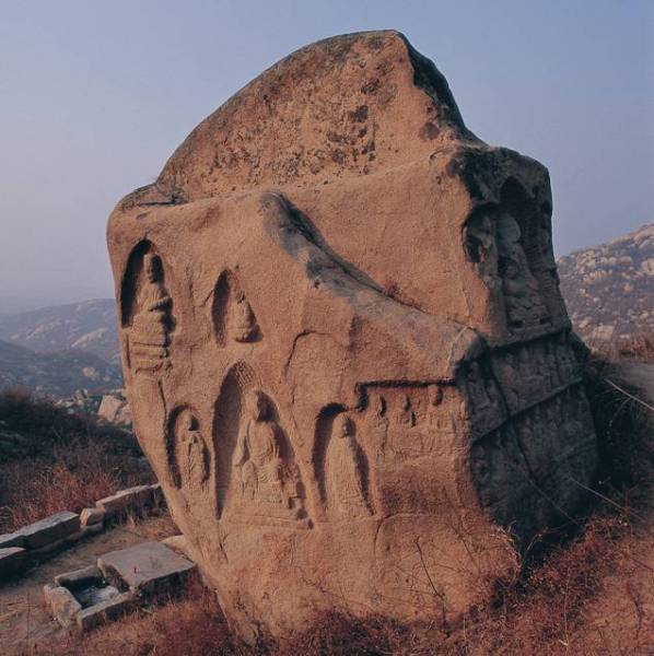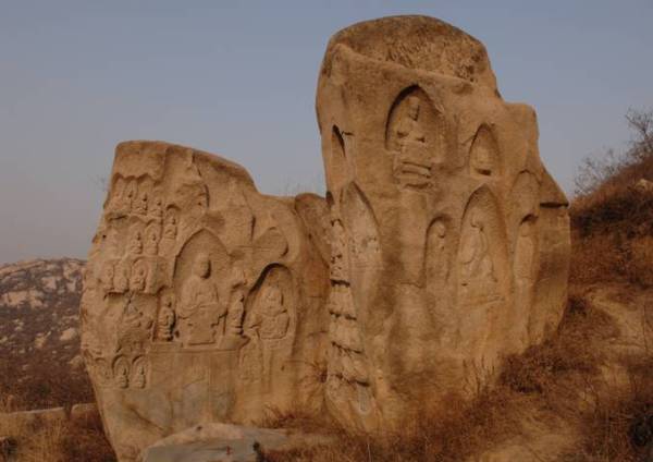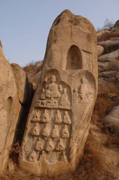 南石北壁(图五、佛沟摩崖造像南石北壁)正中雕十二臂观音及二弟子,通高140厘米,是佛沟摩崖龛像中最大的造像。观音头戴高冠,冠前刻化佛,面相方圆。上身袒,结跏趺坐于仰莲须弥座上。除两臂合十于胸前,两臂平置于腹前外,其余八壁分别置于头顶、肩际和腰部,做出各种不同的手印。二弟子恭立于佛座两侧。在靠近东壁的边缘处刻两个方形小龛,雕刻内容与东壁下部龛相同,均为一主尊二胁侍,多剥泐不清。