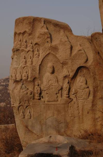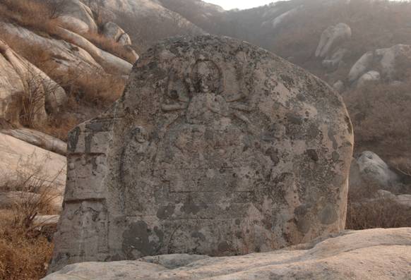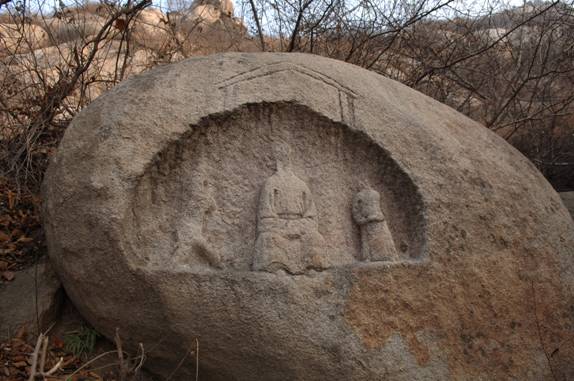 佛沟摩崖造像主要分布在两块巨大的天然巨石上,两石南北相距约30厘米,南石高360厘米,宽270厘米,厚150厘米。四壁环刻造像18龛66尊。(图一、佛沟摩崖造像)南石东壁(图二、佛沟摩崖造像南石东壁)满雕龛像,分四层雕造。上层雕一尖拱形大龛及两个圆拱形小龛,内雕一佛二弟子。主尊头部残,从残迹看应为地藏菩萨,结跏趺坐于方形束腰须弥座上,裙裾覆搭座前,衣纹及手印均剥泐不清。二弟子雕于龛外两个圆拱形小龛内,均双手合十而立。在左弟子龛下有一方形小龛,内雕一主尊及二协侍,形象及衣饰剥泐不清。中层为两个横长方形龛,上下排列,两龛雕刻内容相同,每龛造像三组,每组均为一主尊及二胁侍。最下层造像多剥蚀不清,从中间图像可看出有二小鬼在推磨,应属地狱变内容。不难看出,此壁七个方形龛内雕刻的内容应是十帝阎君造像。另有三龛由于石面的限制,刻于南石南壁及南石北壁。