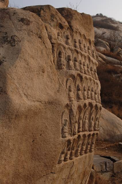 北石西壁雕五十三佛,(图七、佛沟摩崖北石西壁)自上而下雕5层长方形龛,每层龛内雕坐佛7~9尊不等,共39尊,皆有莲瓣形背光,结跏趺坐于仰莲座上。此壁39尊与北石南壁14尊共同组成五十三佛。